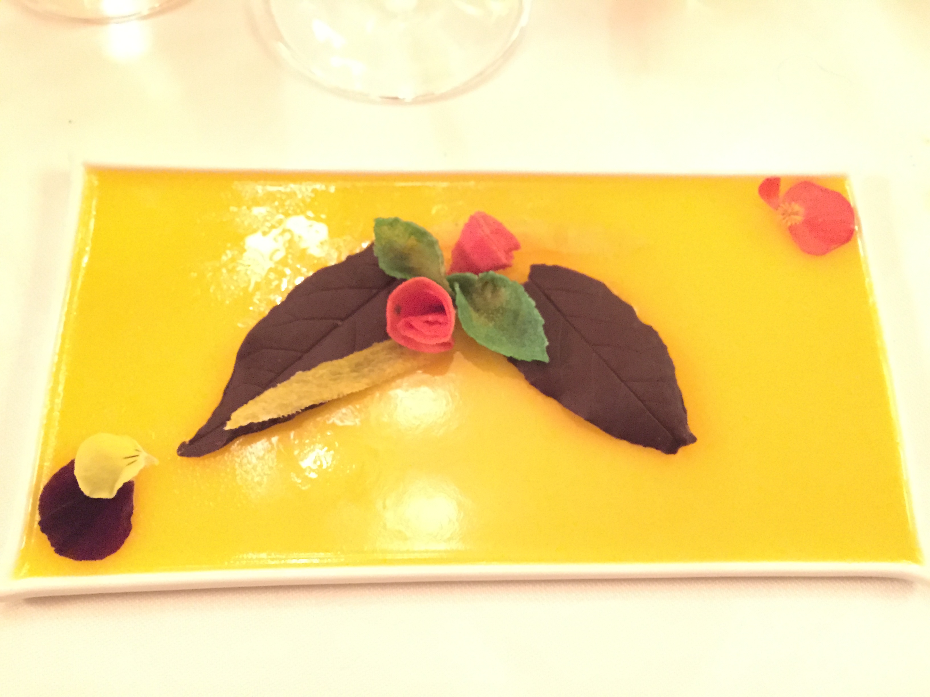 The one dessert I really liked! Mango glee with chocolate leaves and berries. So good!