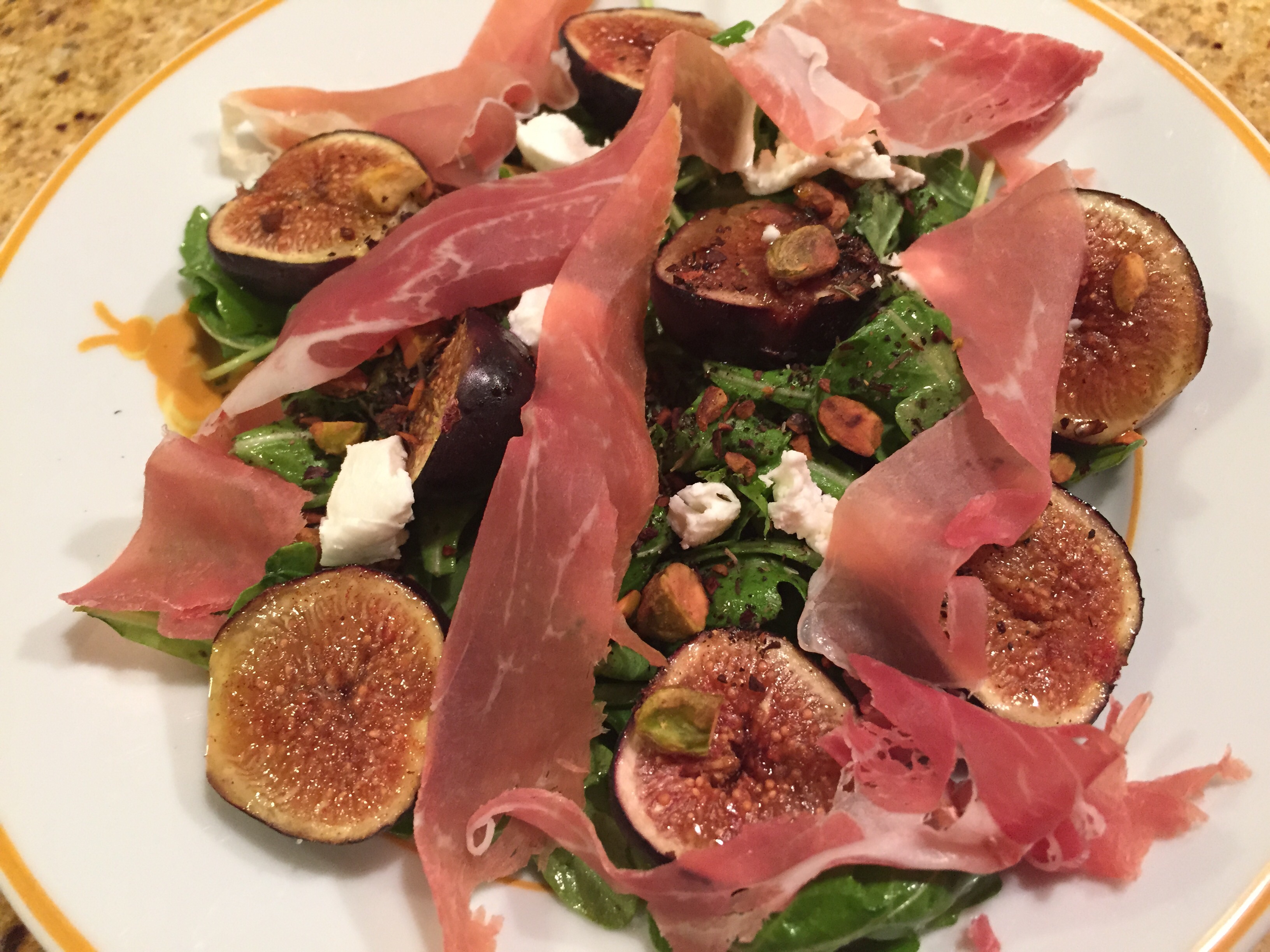 Drizzle the figs with a little melted butter, sprinkle on some cinnamon and sugar and roast in a 400 degree oven for 10 mins. Cool to room temp. Toss arugula in a mustard vinaigrette and plate. Arrange the figs on arugula with goat cheese, chopped toasted pistachios and strips of Parma ham.